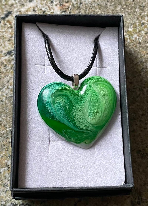 Trevligt hängsmycke i gröna toner.i ett mönster som gör smycket levande. Grundmaterial är Resin i olika färger. 3x3 cm, vit bakgrund.