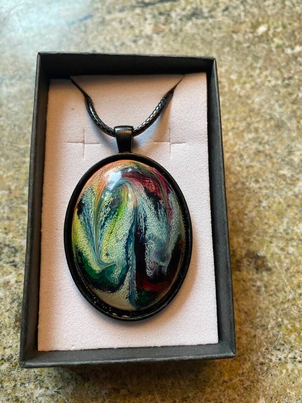 Ett hängsmycke i många färger. Främst mörka nyanser. Storlek 4x3 cm. Grundmaterial är resin i olika färge. Svart ram i rostfritt stål.
