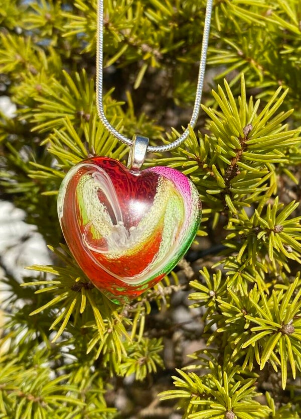 Trevligt flerfärgat hjärta 2x2 cm. Främst i röda/vita/gula toner. Grundmaterial är resin i olika färger.