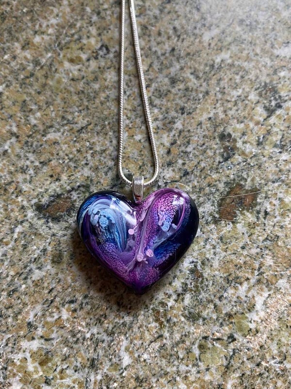 Ett vackert hjärta i blått och lila. Svart bakgrund. Grundmaterial är resin i olika färger. Storlek 2x2cm.